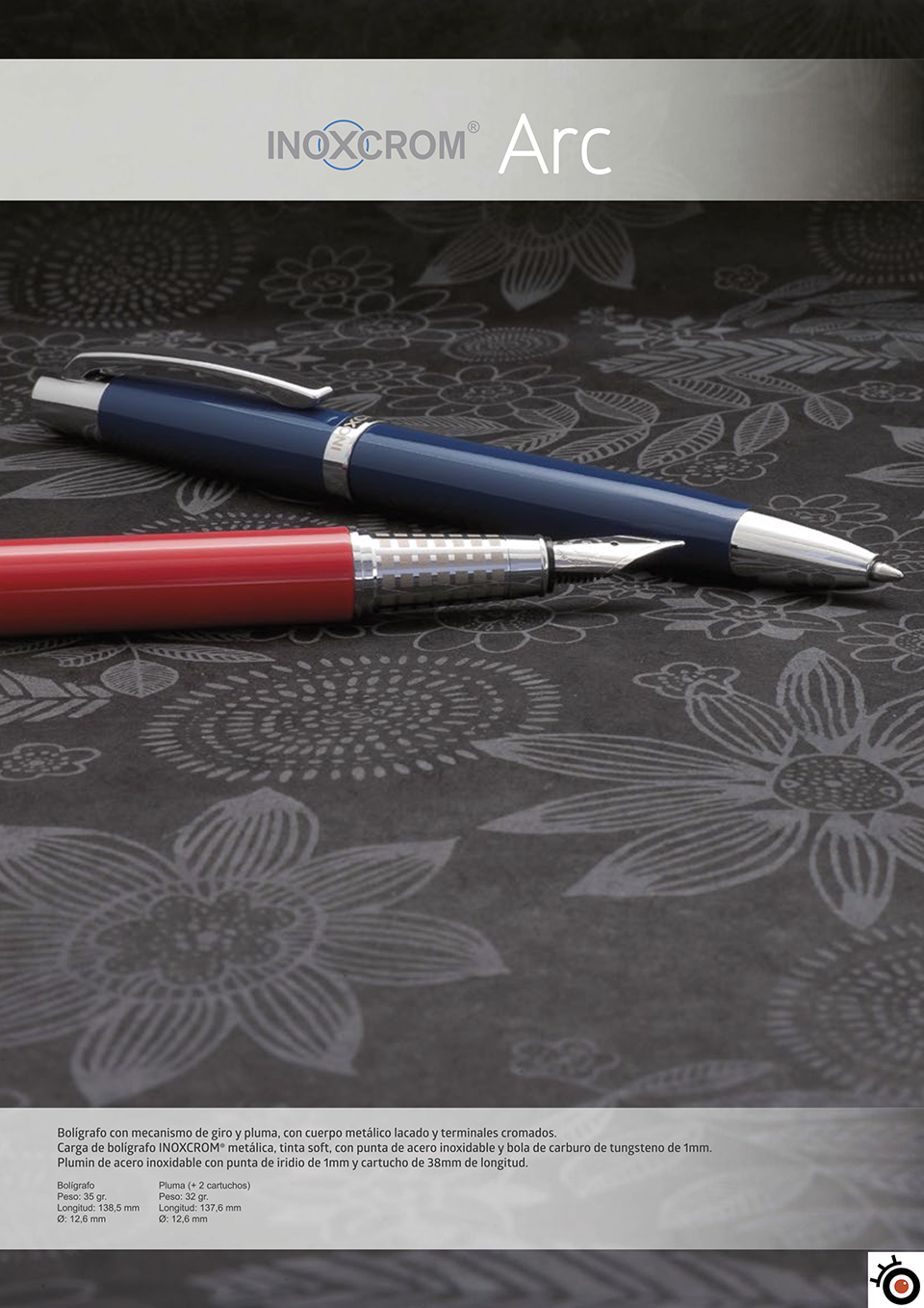 Pluma estrecha color negro roscado sobre boquilla negra. Capuchón en acero liso, acabado en pintura negra mate. La boquilla presenta anchos surcos longitudinales. El capuchón esta marcado con Inoxcrom rombo 77 rombo Spain rombo.