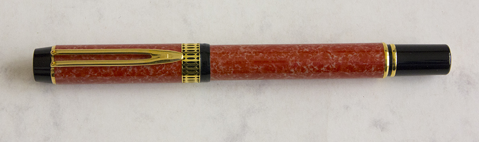 El cuerpo y el capuchón están fabricados en ebonita color Red Ripple